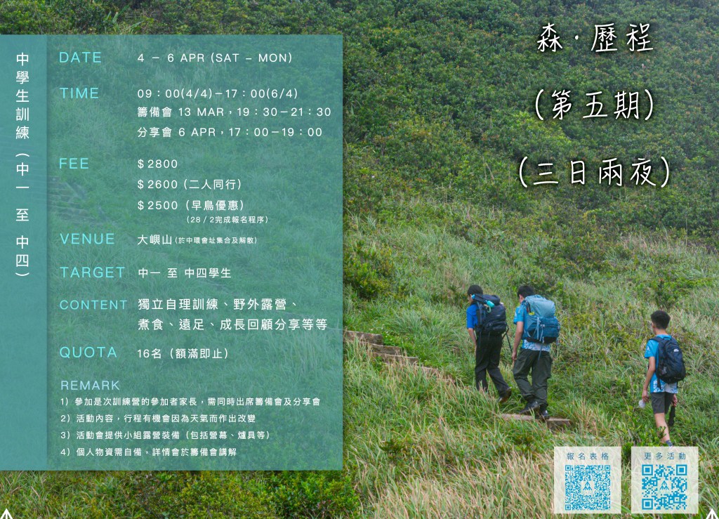 「寶劍鋒從磨礪出,梅花香自苦寒」,讓青年人透過一連串艱辛的野外挑戰,磨練並鼓勵學生朝著共同目標奮鬥。過程中他們彼此分享各自的感受與學習,透過自省及反思更了解自己。經歷過外在的體能挑戰,體會內在的心靈旅程,學員將重新發現自己無盡的潛能,去實踐抱負與夢想。