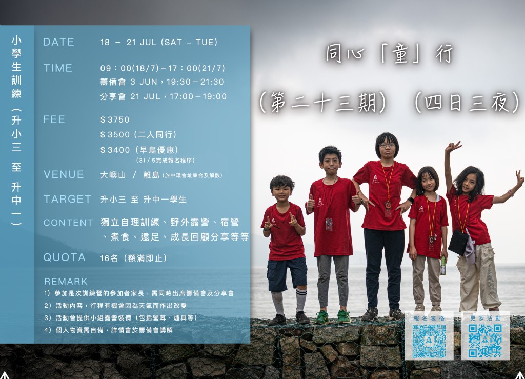 | 備註 | 1)參加是次訓練營的參加者家長,須同時出席 7 月 2 日晚上之籌備會及 7 月 21 日黃昏之分享會 2)活動內容、行程有機會因為天氣而作出改變 3)活動會提供小組露營裝備(包括營幕、爐具等) 4)個人物資須自備,詳情會於籌備會講解 |